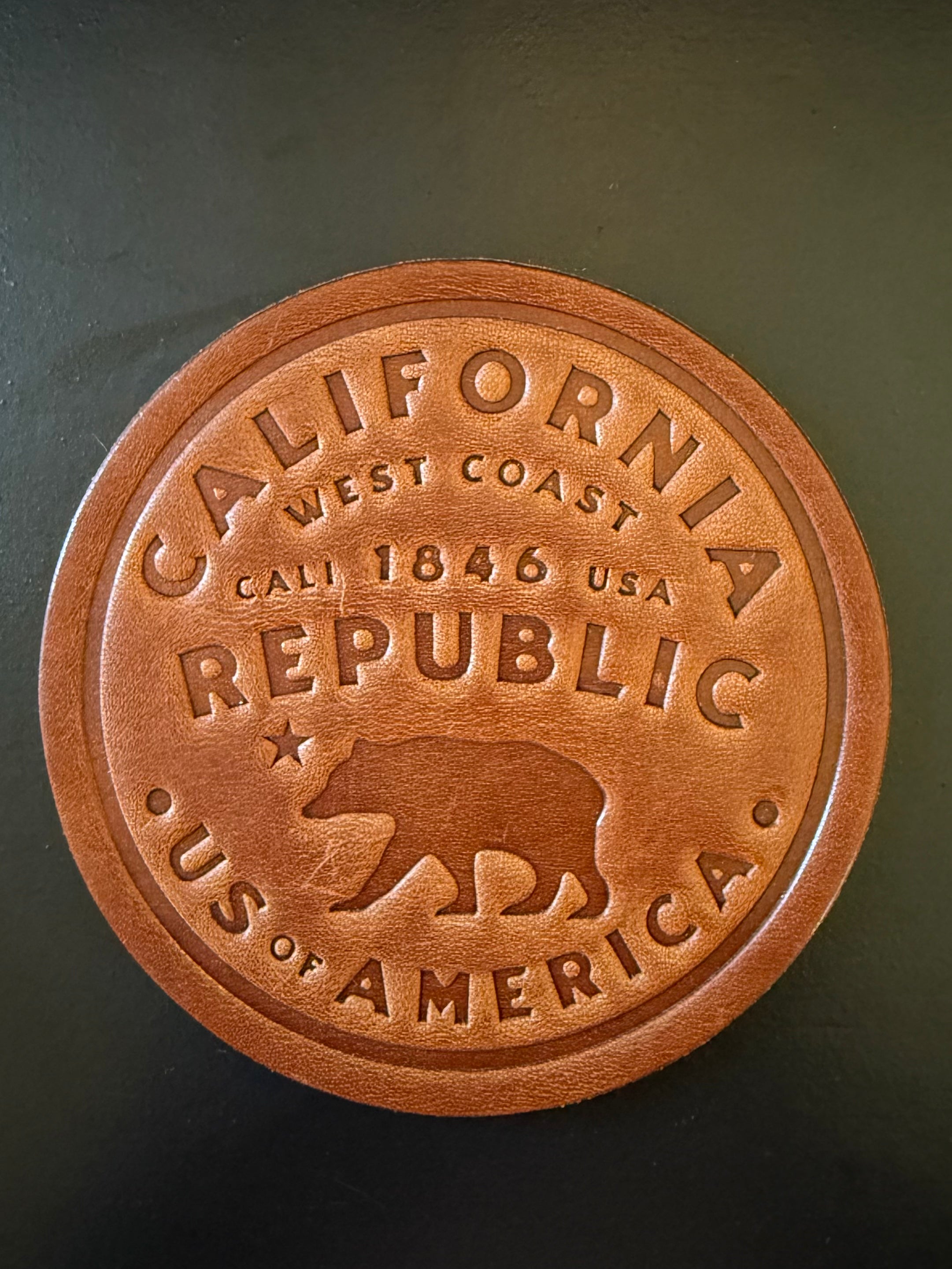 This rustic leather coaster features the classic 'California Republic' engraving, complete with the iconic bear, a subtle nod to West coast pride. Durable and handsome, it adds a touch of warmth to any coffee table or kitchen counter. It's a little slice of CA, right under your glass!