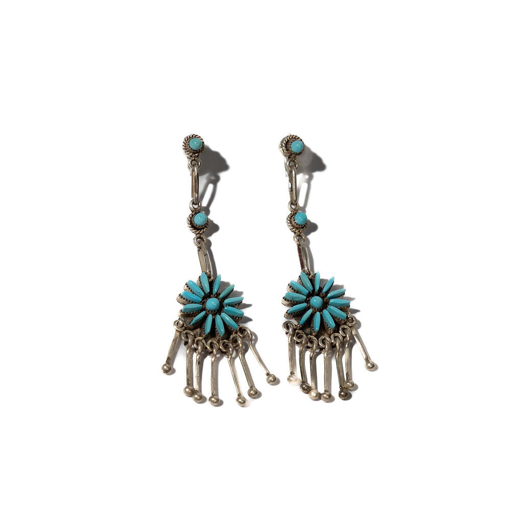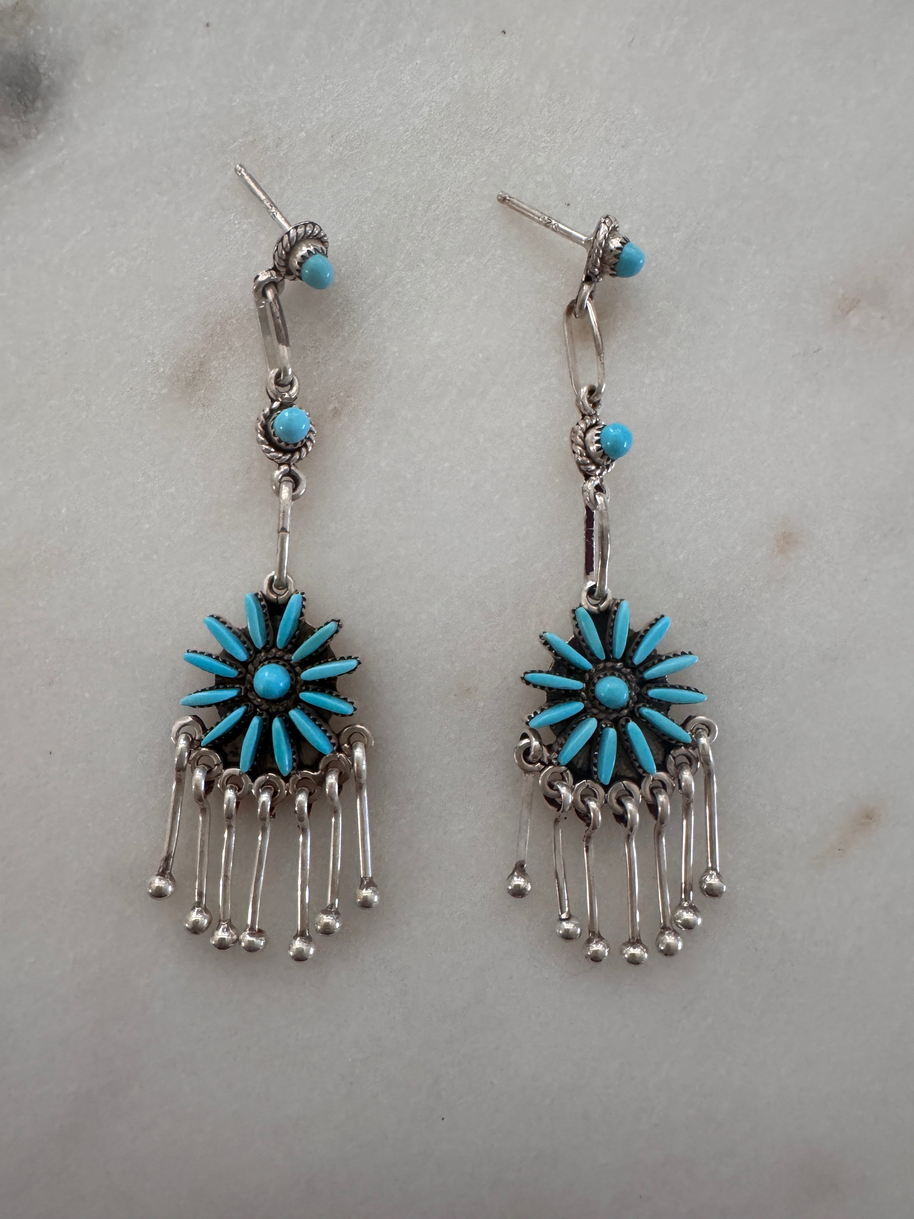 Delicate turquoise needlepoint stones radiate from a floral center in these handcrafted sterling silver earrings, complete with swingy dangles for a playful, eye-catching finish.
