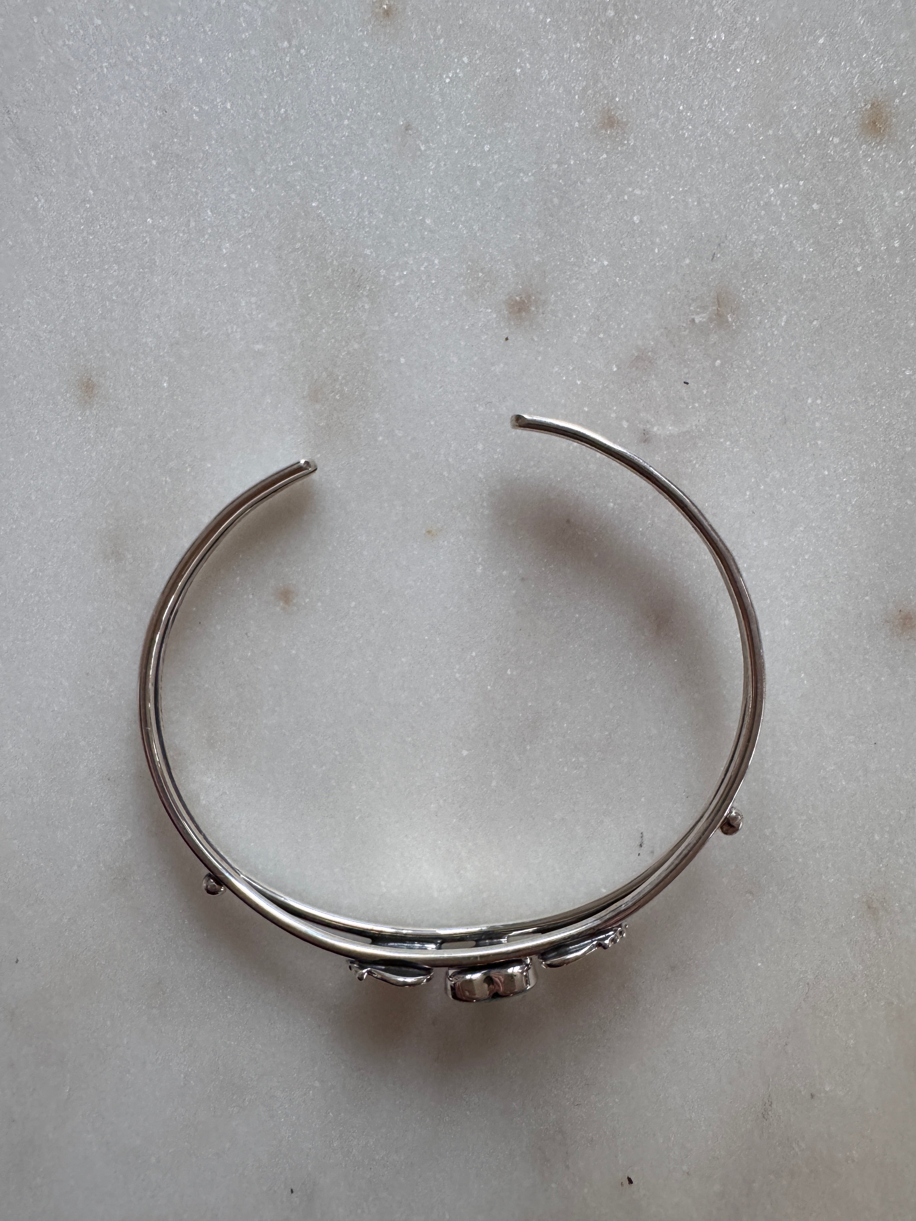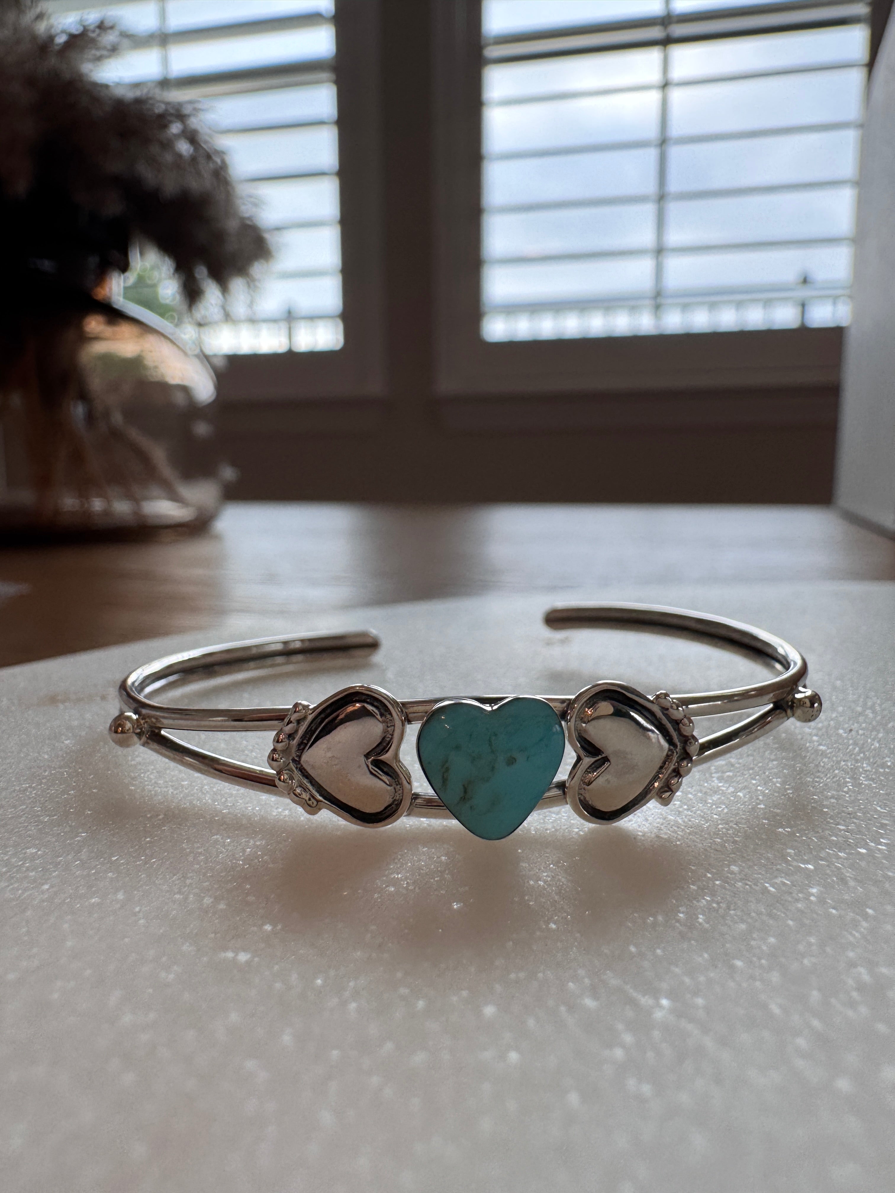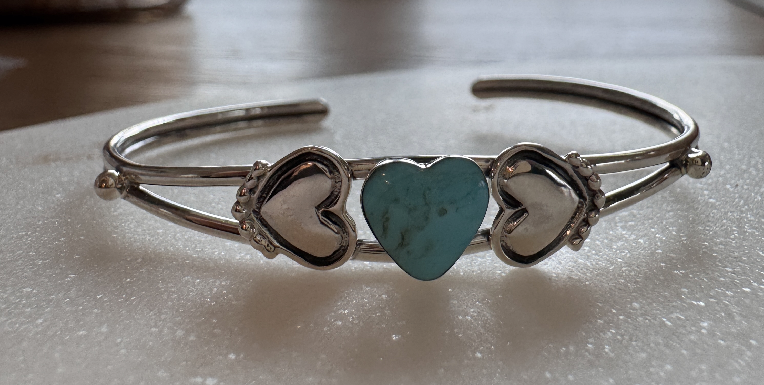The Heart Stone Sky Cuff by Sadie Jim is a stunning handcrafted piece, featuring a vibrant turquoise heart centerpiece set in sterling silver. Expertly designed with traditional Navajo craftsmanship, the cuff showcases intricate silverwork, from delicate hand-stamped details to a gracefully contoured band. The bold yet elegant design makes it a timeless statement of love, strength, and heritage, perfect for any jewelry collection.