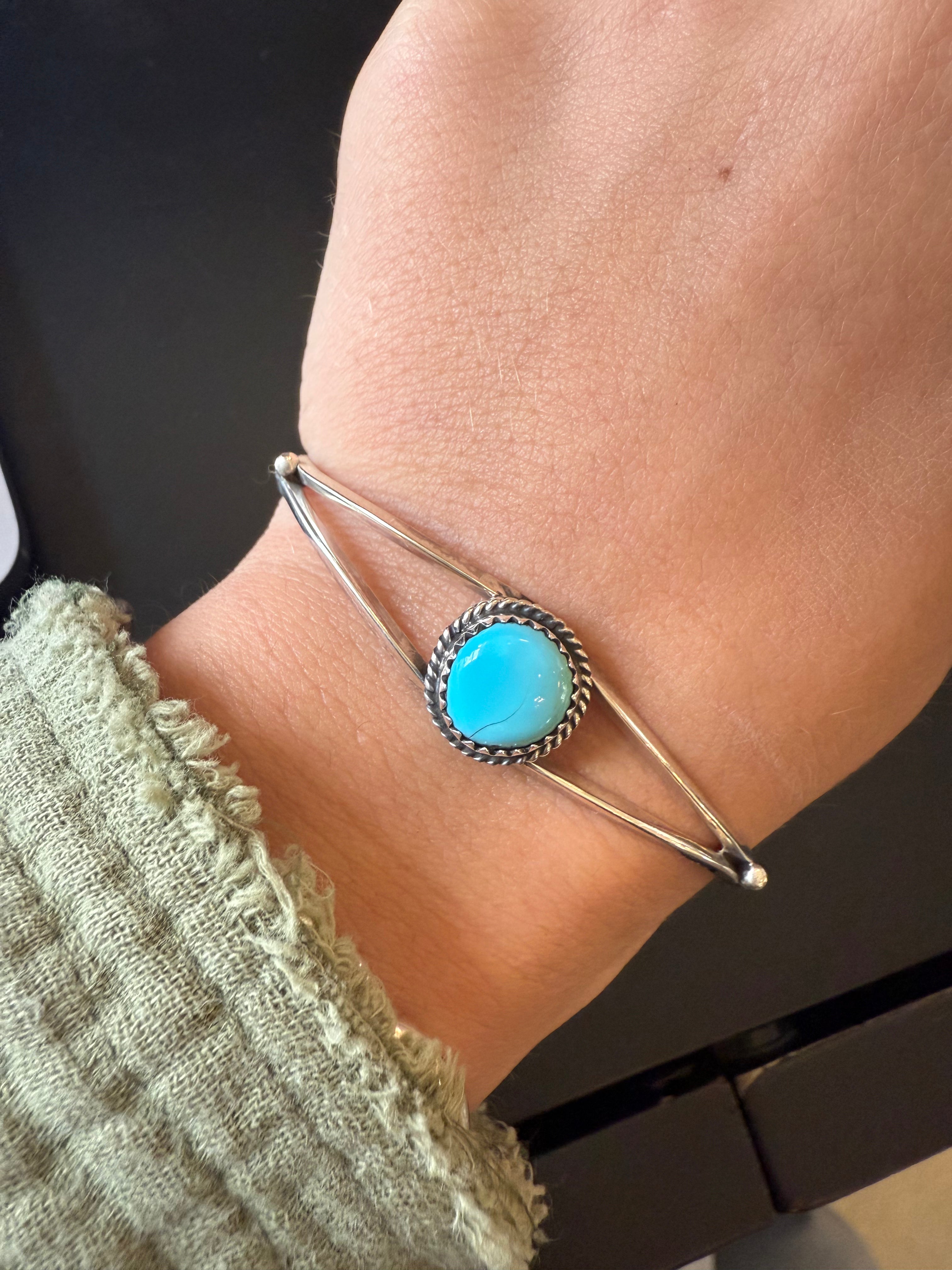 Expertly crafted by Navajo silversmith Judy Largo, this sterling silver cuff features a circular turquoise stone, embellished with delicate silver crimping around the edges. Classy and bold, it'll add a pop of color to your favorite looks!
