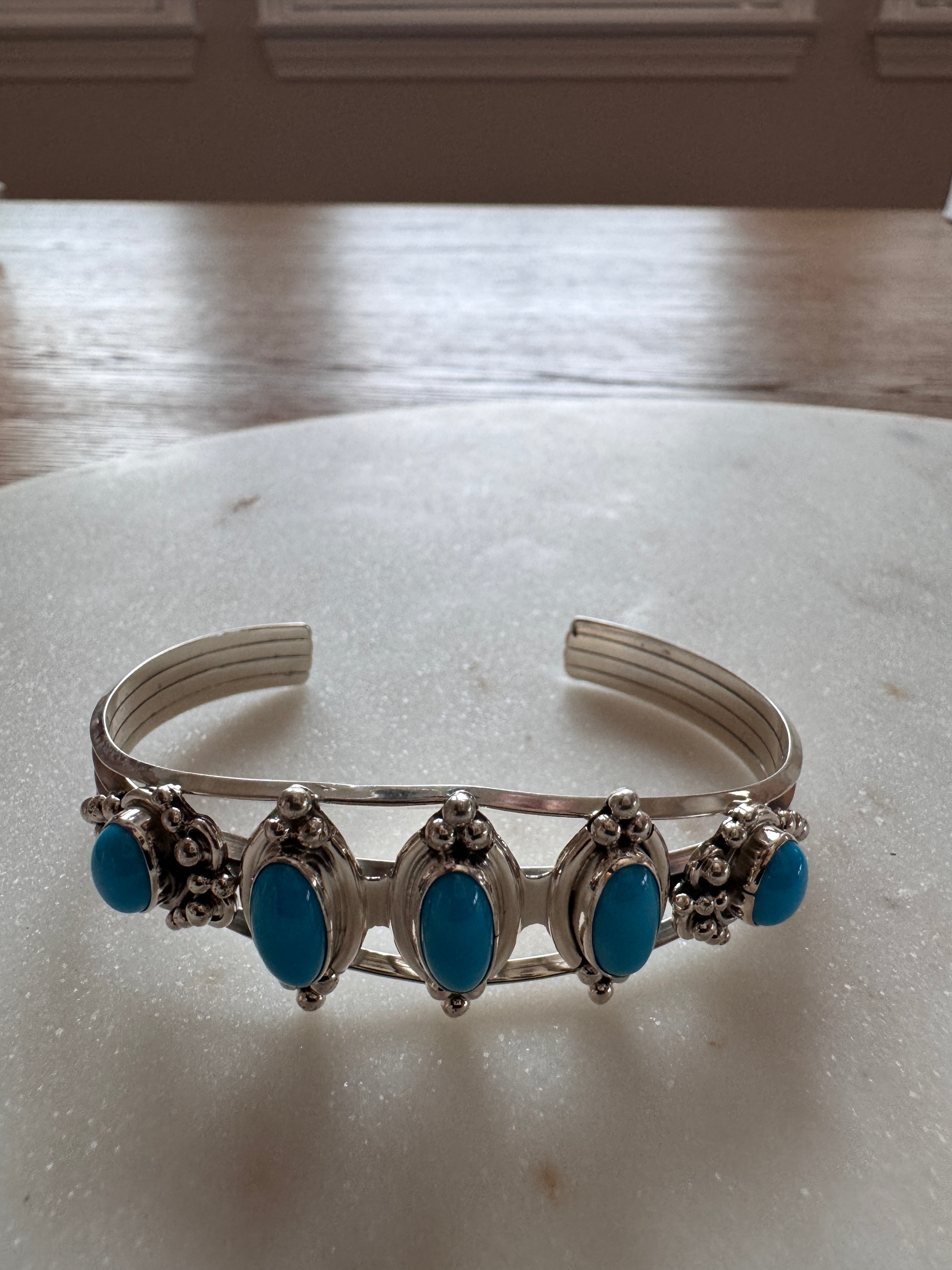 The Sleeping Beauty Turquoise Five-Stone Cuff is a breathtaking piece crafted from sterling silver, featuring five vibrant Sleeping Beauty turquoise stones. Known for its sky-blue hue and unmatched clarity, the turquoise is elegantly set in a handcrafted cuff adorned with intricate silverwork, showcasing traditional artistry. This timeless bracelet blends bold beauty with classic Southwestern elegance, making it a perfect statement piece for any collection.
