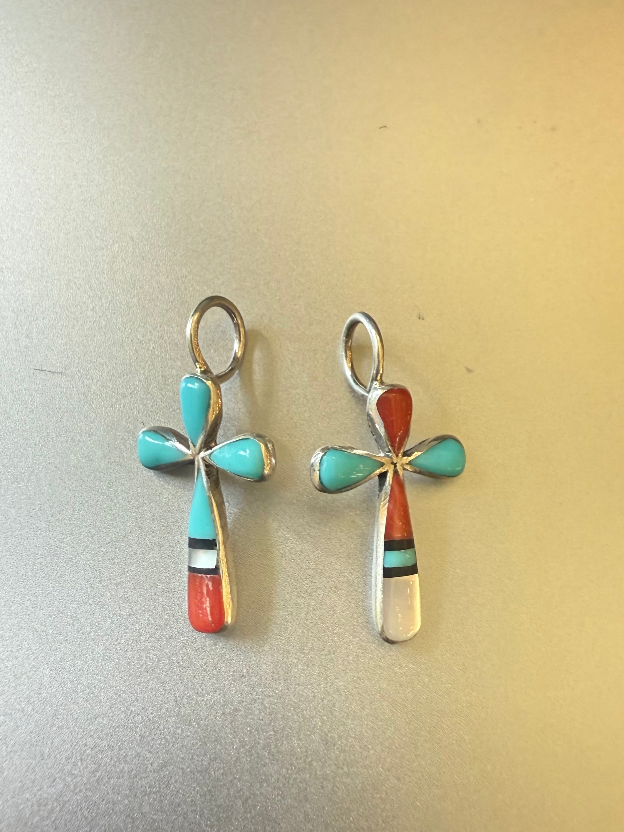 This pendant, crafted by Zuni artisan Kristina Bowannie, is made of sterling silver and features small turquoise stones in the shape of a cross.