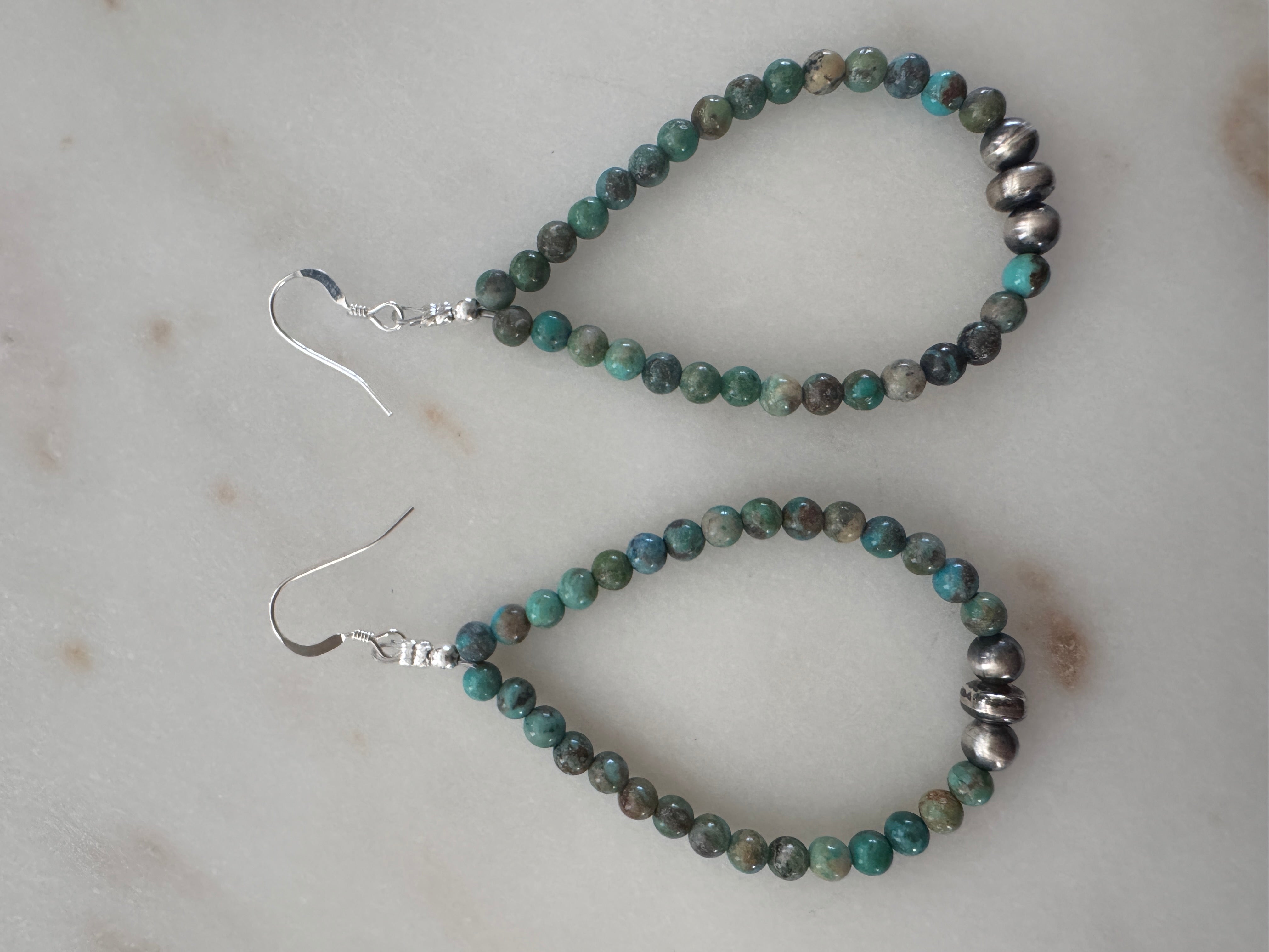 Earthy gemstone beads in natural green and blue hues form a graceful teardrop shape, accented with sterling silver desert pearls — a grounded, nature-inspired design with effortless charm.
