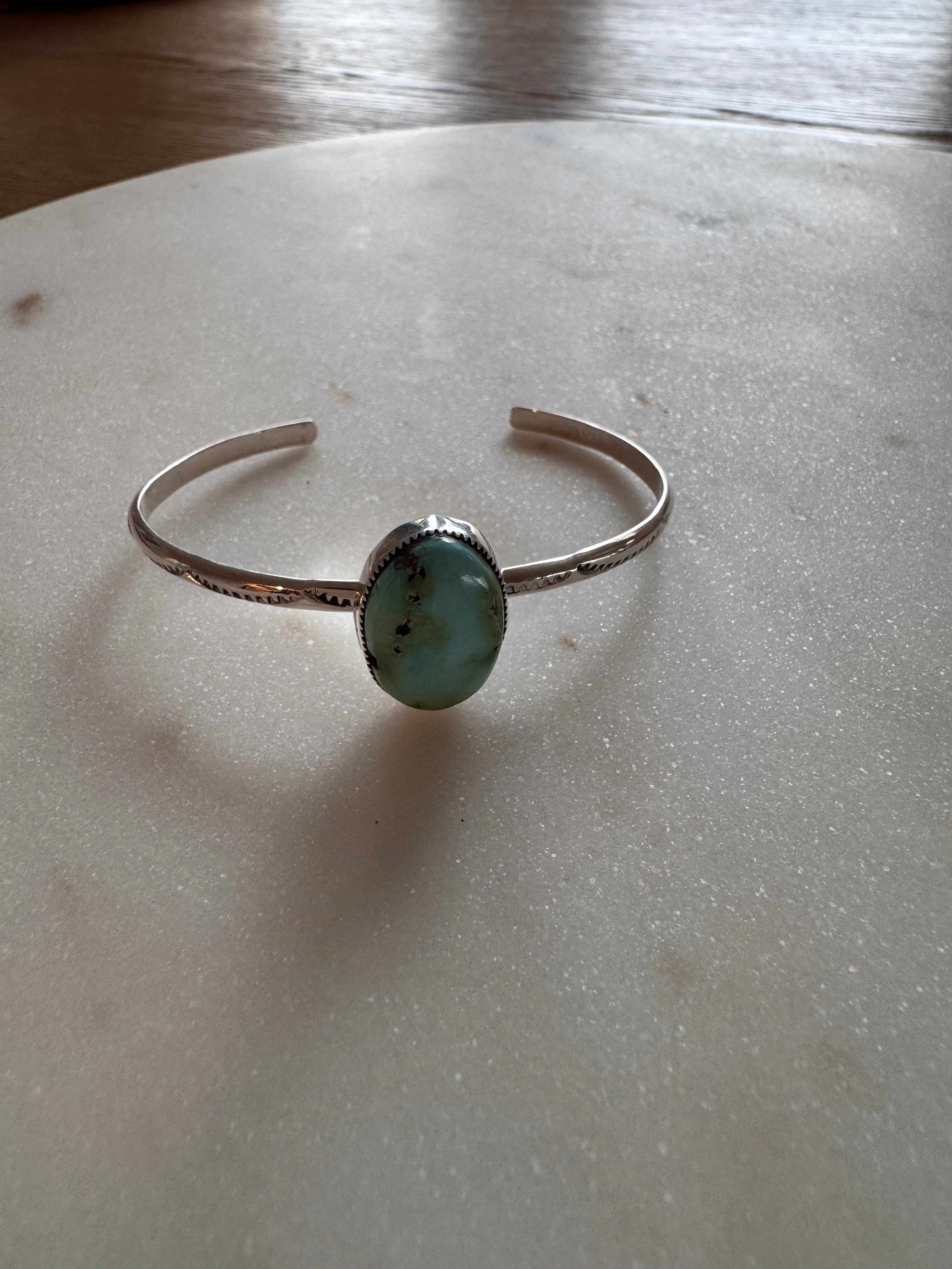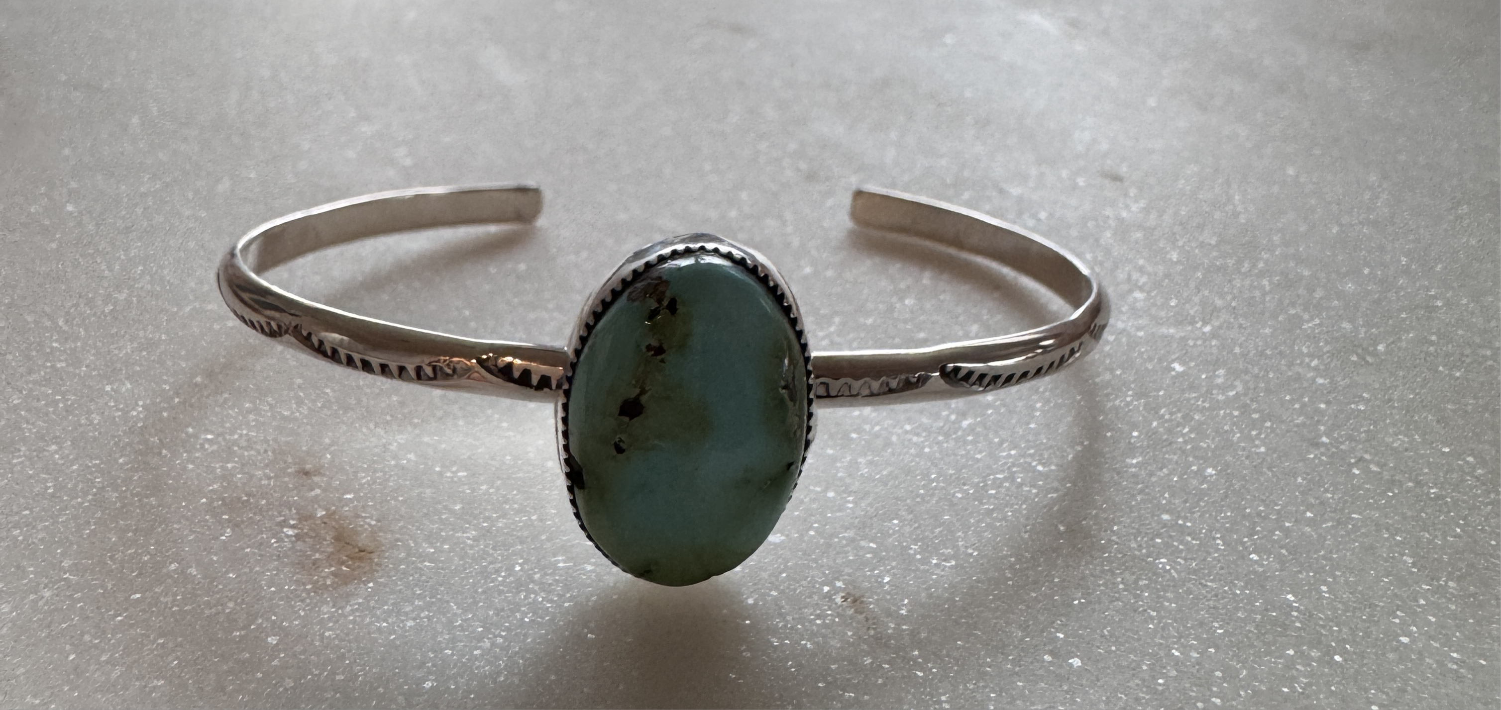 The handmade Desert Sky cuff is inspired by the blend of blue turquoise and brown earth tones, reminiscent of the vast desert landscape.