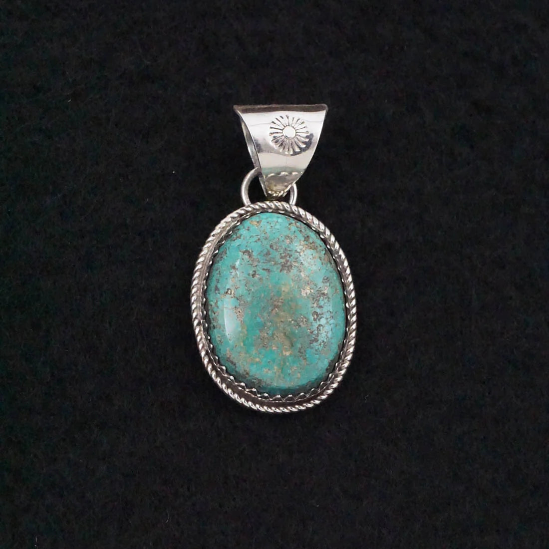 This handcrafted pendant by Navajo silversmith Ernest Hawthorne features sterling silver paired with a beautiful natural Royston turquoise stone, known for its rich mix of blues and greens with a warm, earthy matrix. The pendant measures 1 1/4" in length and 5/8" in width, offering a balanced design that highlights both the stone’s natural beauty and Hawthorne’s skilled silverwork.
