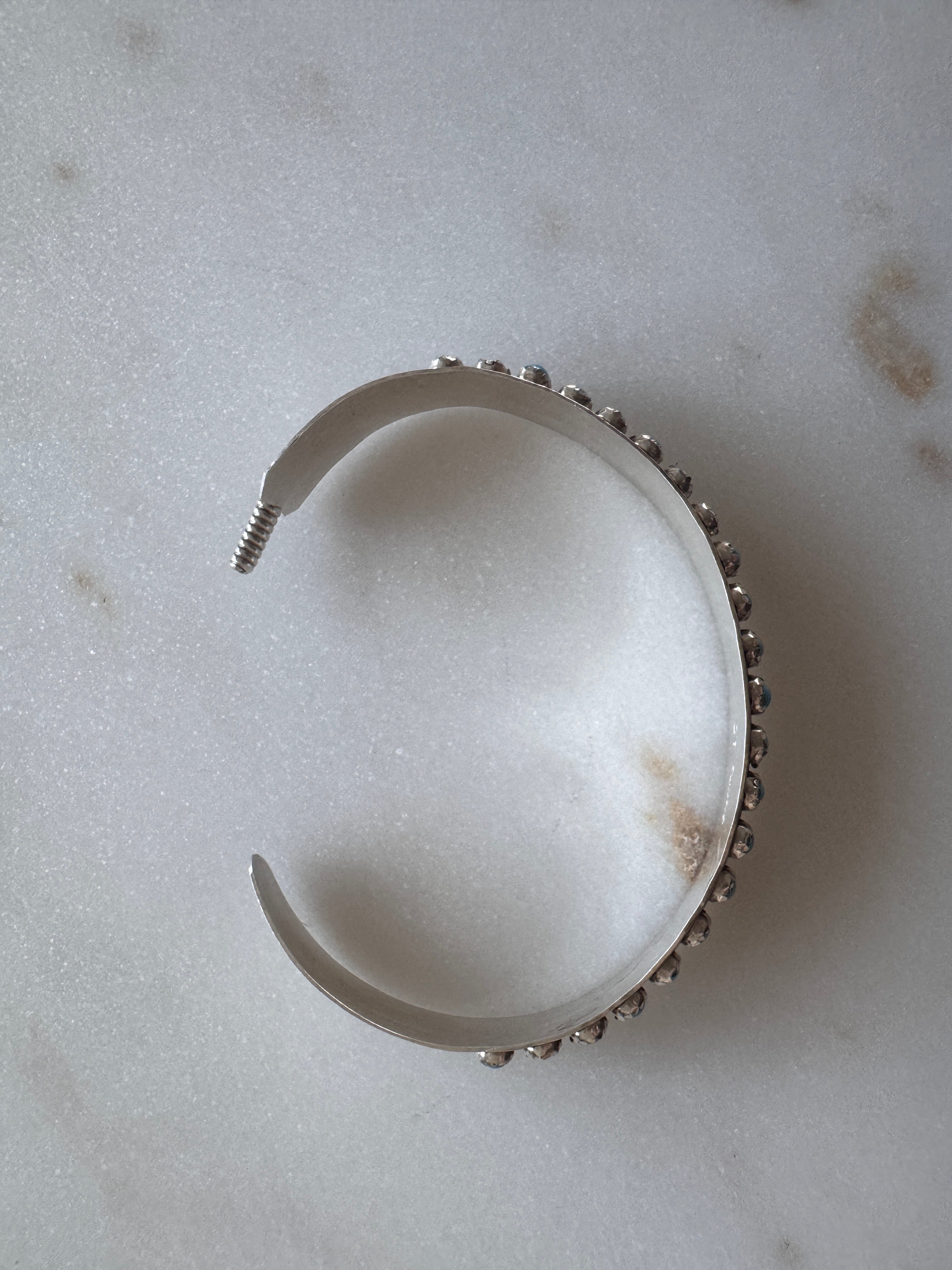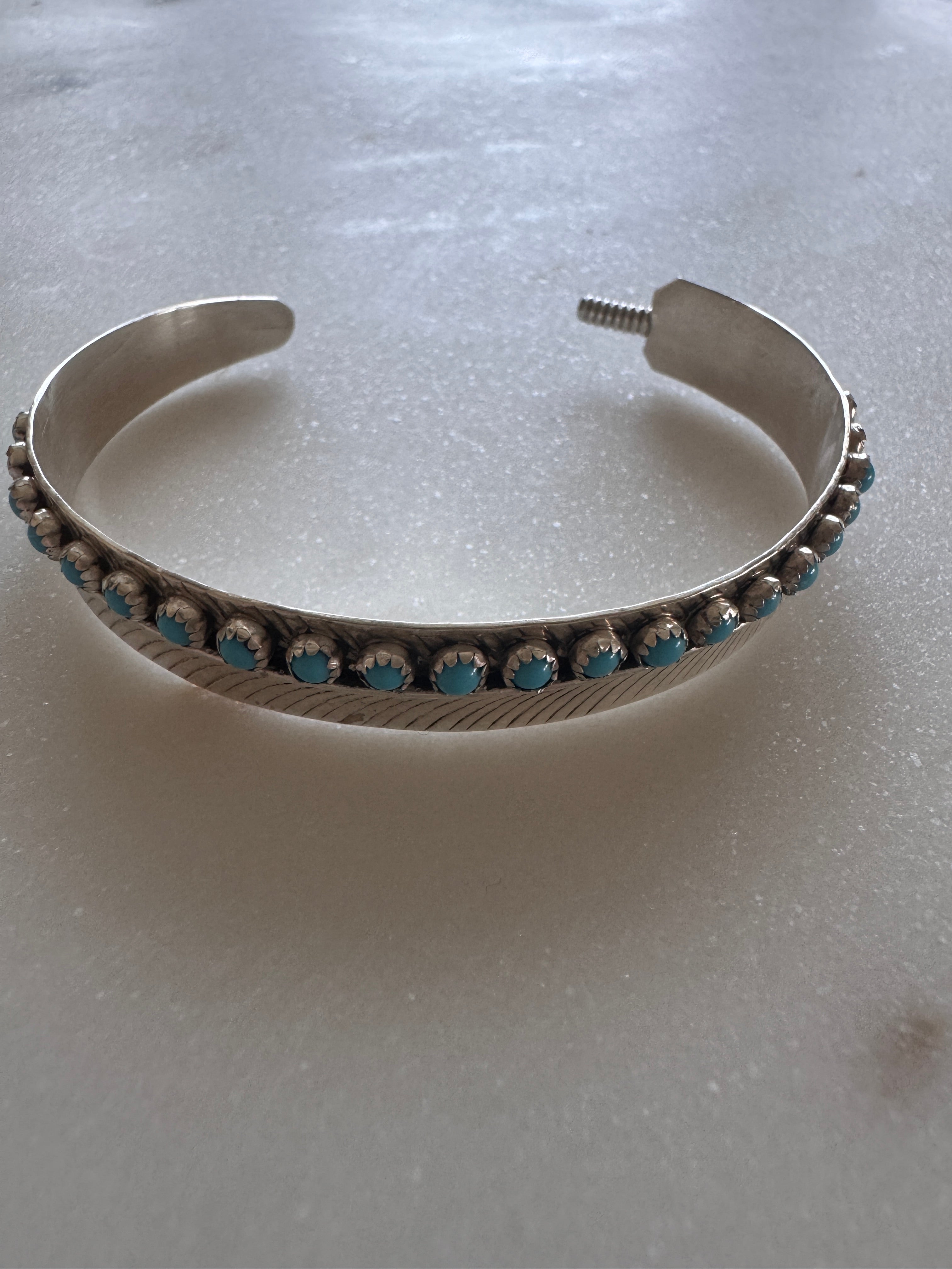 A bold sterling silver cuff showcasing a perfect row of vibrant turquoise stones, framed by intricate leaf-stamped detailing. This piece evokes the quiet strength and beauty of the desert at dusk—strong, serene, and endlessly captivating.