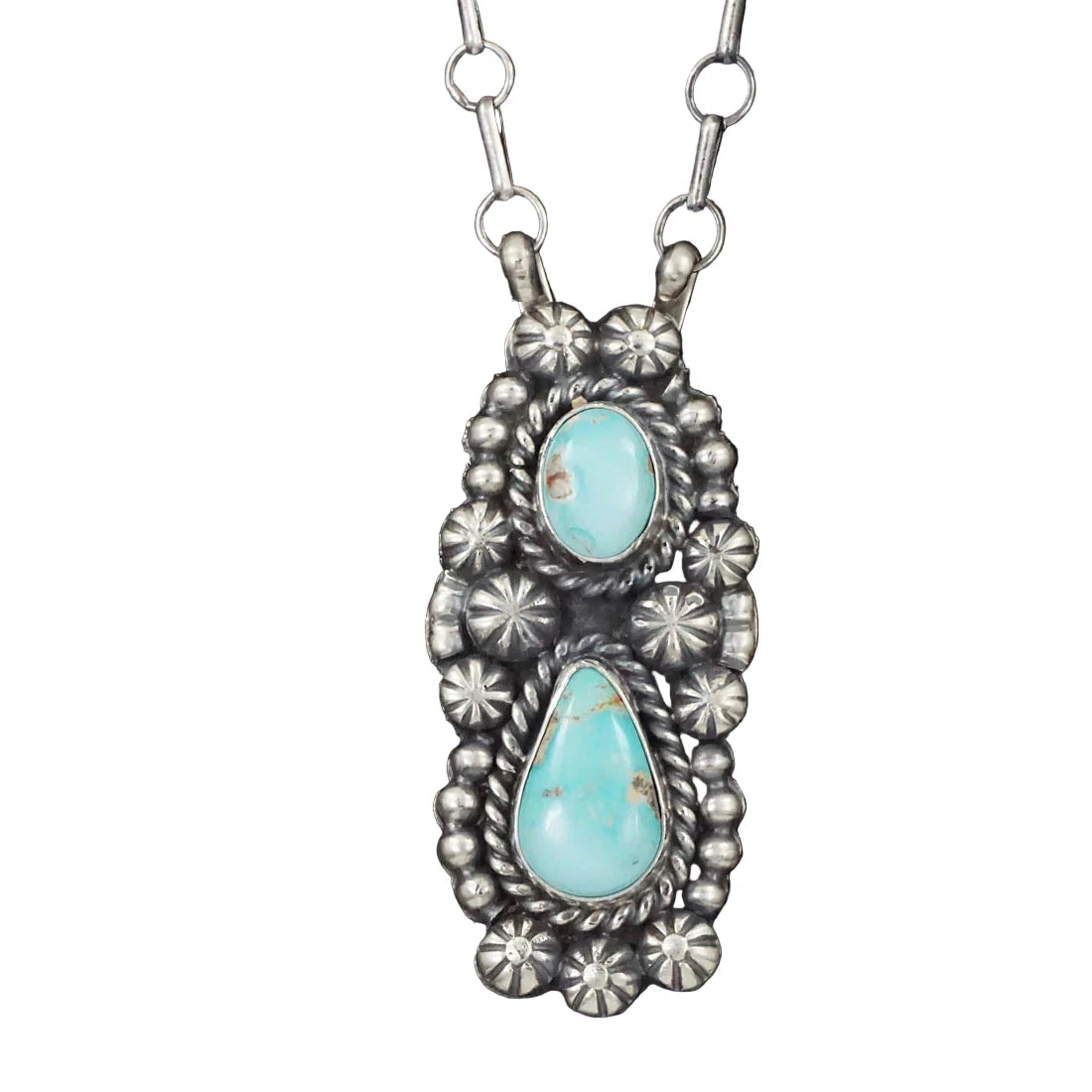 This handcrafted necklace by Navajo silversmith Jeff James features sterling silver and a stunning natural Sonoran turquoise stone, known for its vivid green and blue tones with rich matrix. The piece blends traditional Navajo design with refined silverwork, creating a timeless Southwestern look. The necklace measures 20 inches with an additional 2-inch extender chain for adjustable length and comfort.
