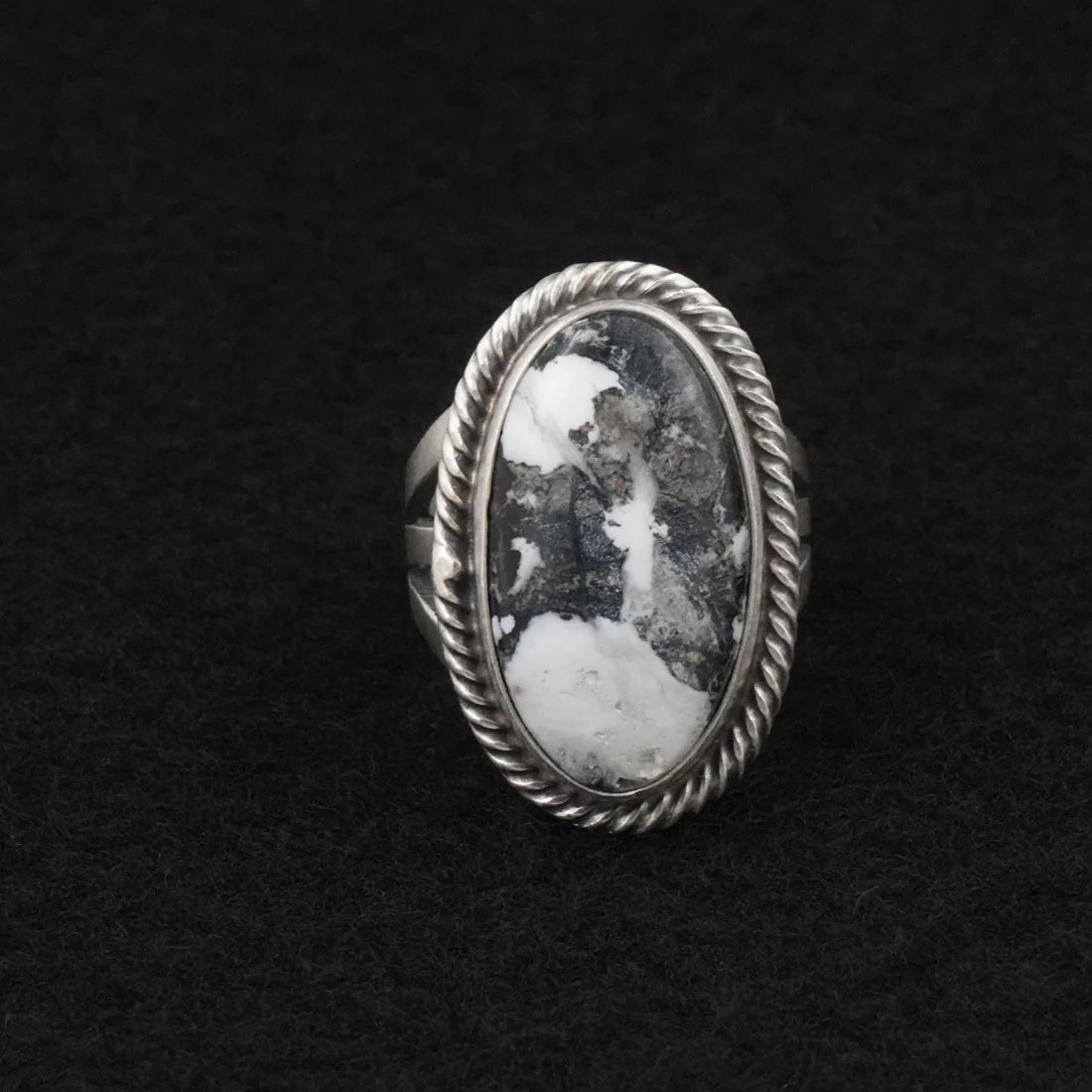 This handcrafted ring by Navajo silversmith Kathleen Livingston features sterling silver and a striking White Buffalo stone, known for its bold contrast of white with deep black veining. The ring is size 7 and measures 1 1/8" in length and 3/4" in width, making it a standout piece with a strong, elegant presence. Hallmarked “Kathleen Livingston, Sterling.”