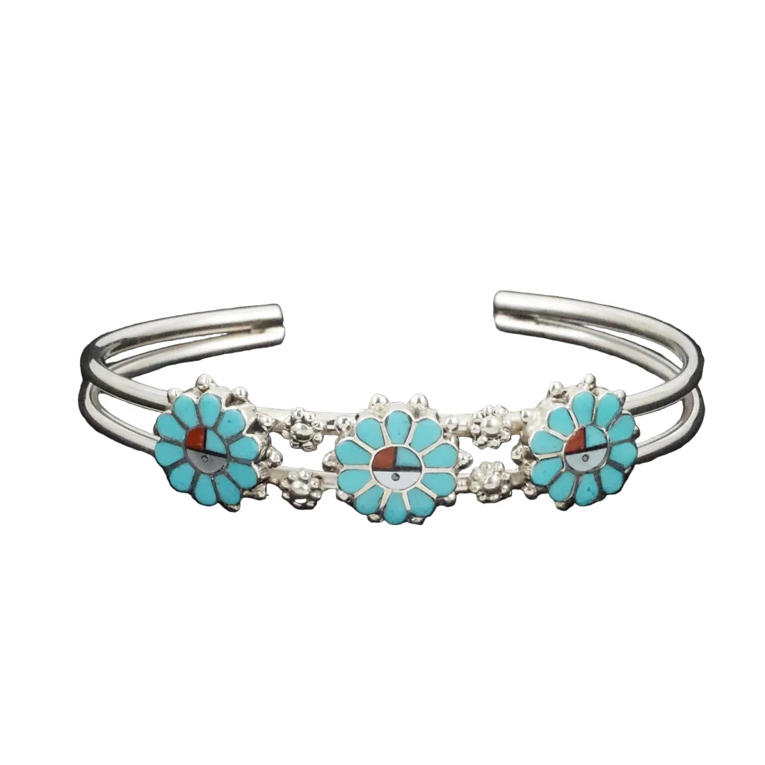 Handcrafted by Zuni silversmith Maxine Soseeah, this stunning bracelet features intricate inlay work in sterling silver with mother of pearl, onyx, coral, and turquoise. The vibrant stones are expertly arranged in traditional patterns, showcasing Soseeah’s precision and artistry. Sized at 5 1/4" with a 3/4" gap, it fits a 6" wrist comfortably. A beautiful example of classic Zuni craftsmanship.