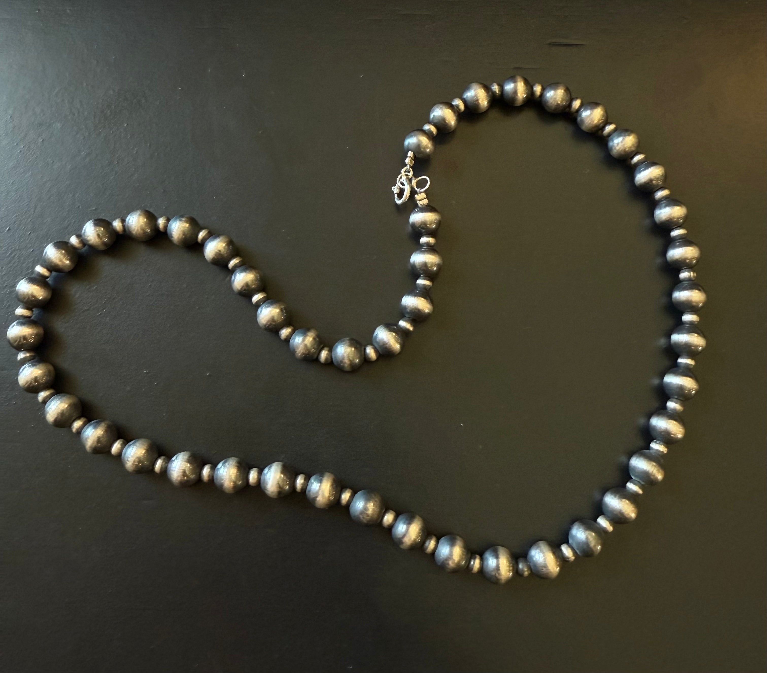 A set of silver beads, also known as Navajo pearls, are strung together to create this elegant and timeless necklace - the perfect accessory to both your formal wardrobe, and everyday wear!