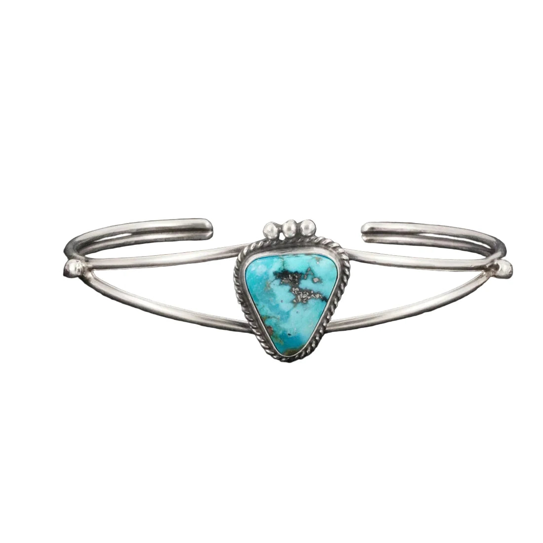 Expertly handcrafted by Navajo silversmith Rena Begay, this bracelet features sterling silver paired with a striking natural Kingman turquoise stone. Known for her clean, elegant designs, Begay highlights the stone’s vivid color with beautifully executed silverwork. Measuring 5 1/8" with a 3/4" gap, it is sized to fit a 5 7/8" wrist. A timeless piece that blends tradition with refined Southwestern style.