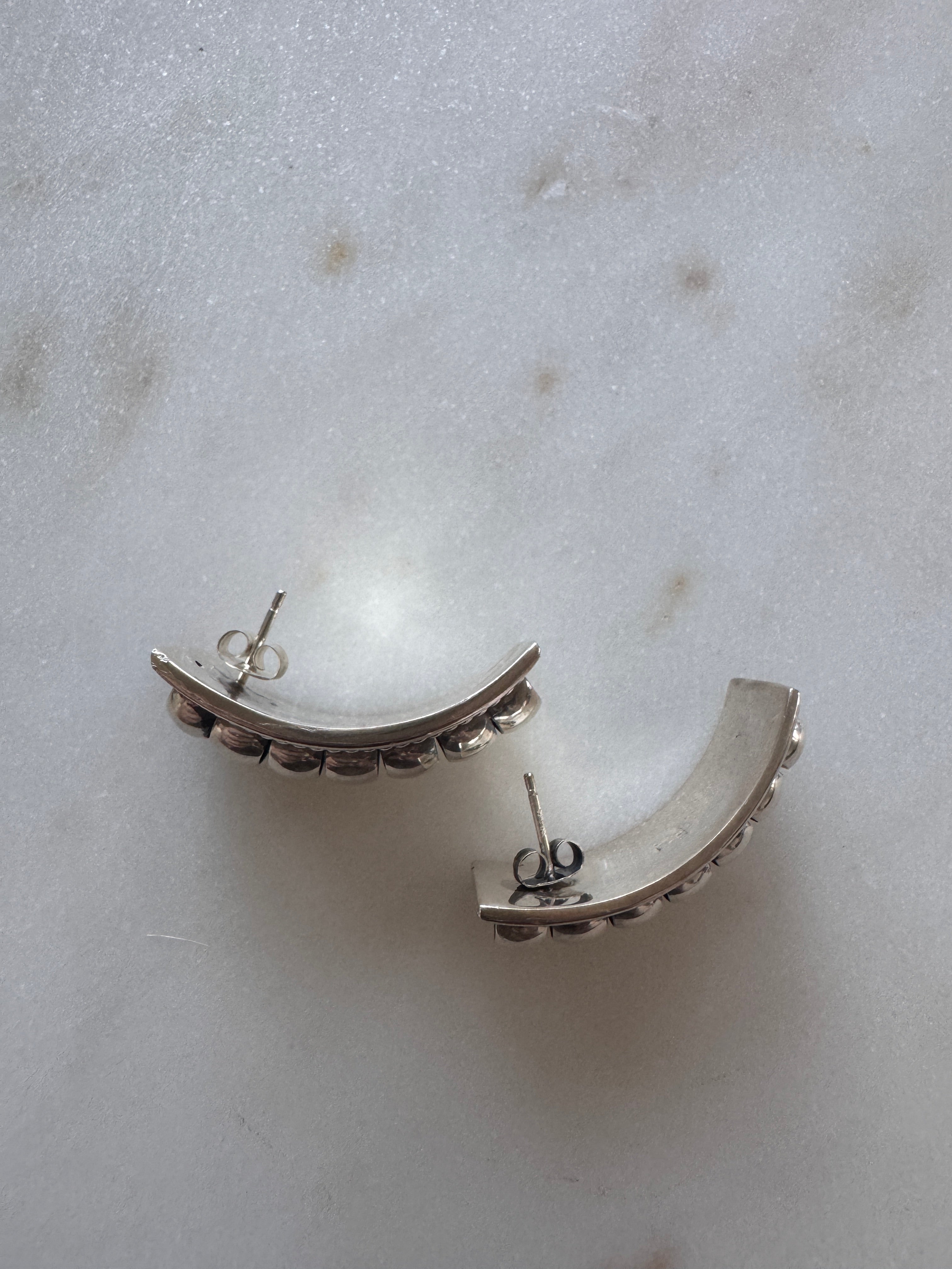 Sculpted in sterling silver with a bold crescent silhouette, these earrings blend domed detailing and twisted rope trim for a statement look inspired by rugged landscapes and timeless craft.