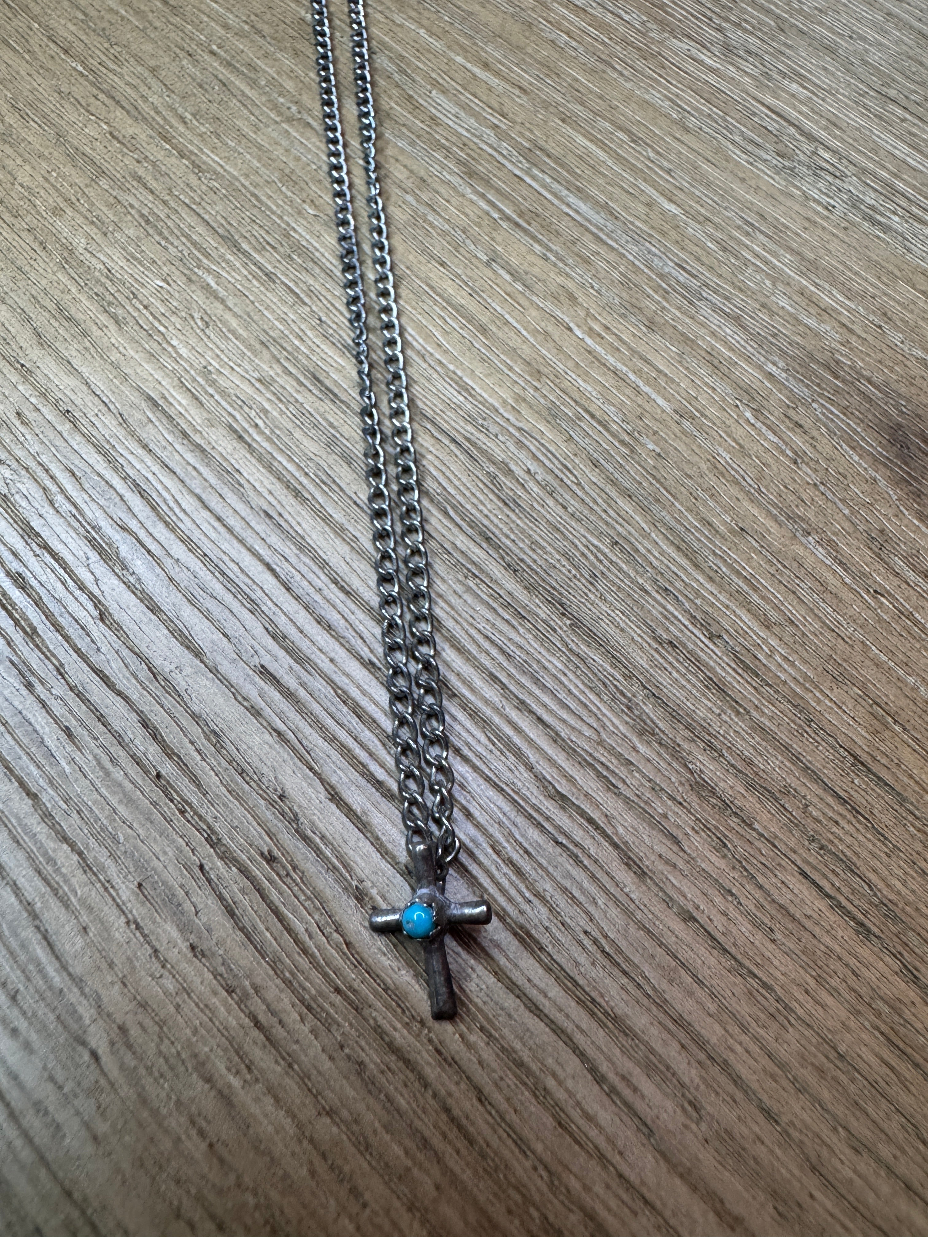 This vintage necklace features a sterling silver cross pendant and chain, accented with turquoise stones. The intricate design and high quality materials make it a timeless and elegant addition to any outfit. Perfect for expressing one's faith, this necklace is a must-have for those seeking a unique and beautiful accessory.