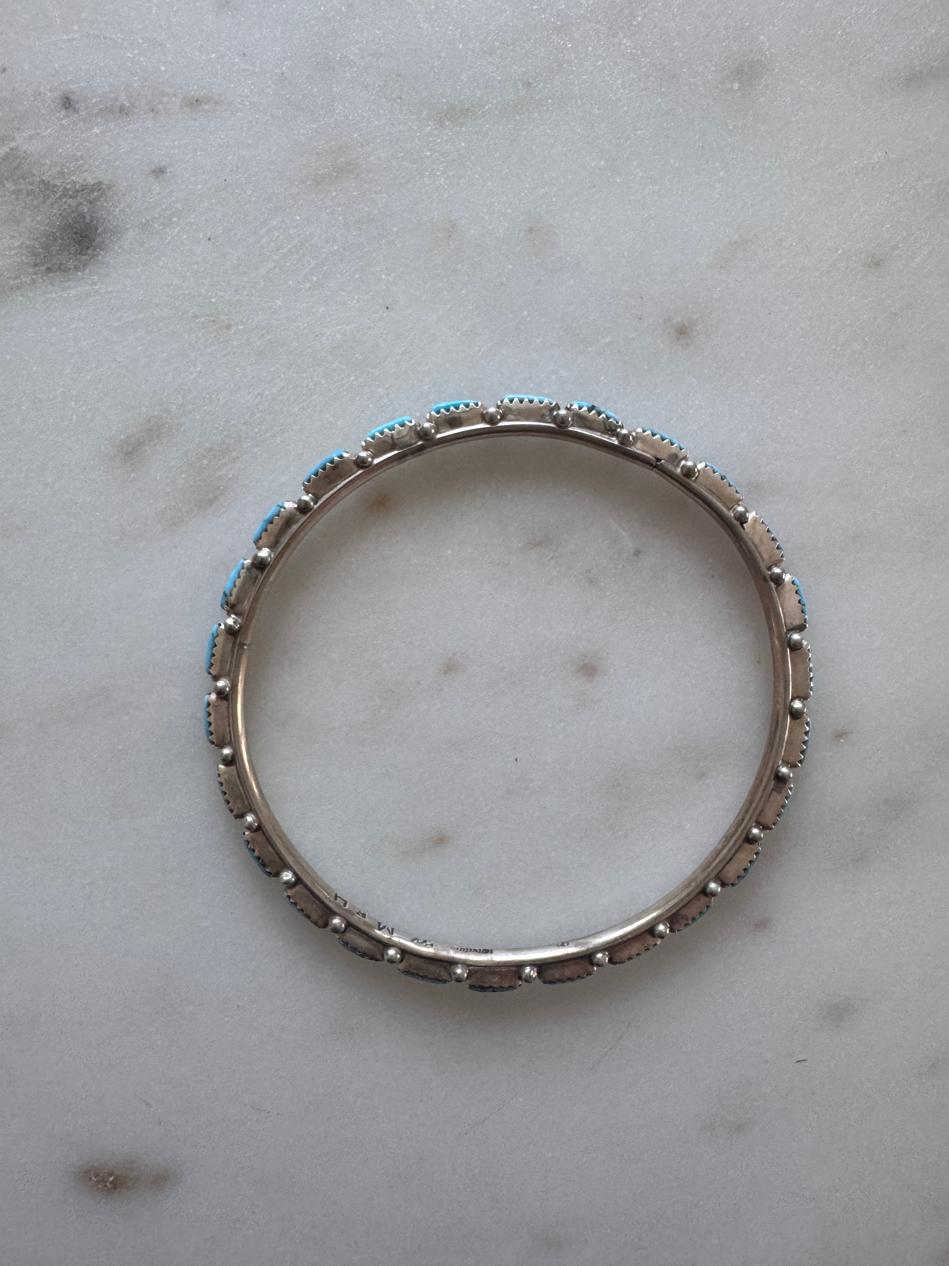 This vintage sterling silver bangle features a continuous row of bezel-set turquoise stones, framed by hand-stamped details and silver drops. A sleek, Southwestern classic with a bold edge.
