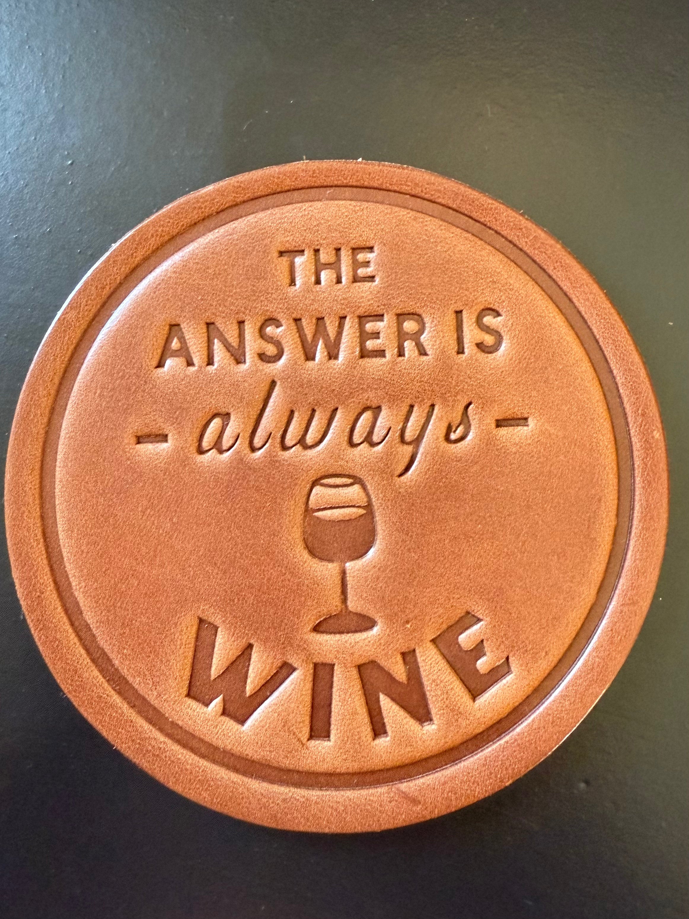 This coaster calls it like it is: the answer is always wine! Stamped into warm brown leather with a wine glass for good measure, it's the perfect accessory to pull out for a social gathering!