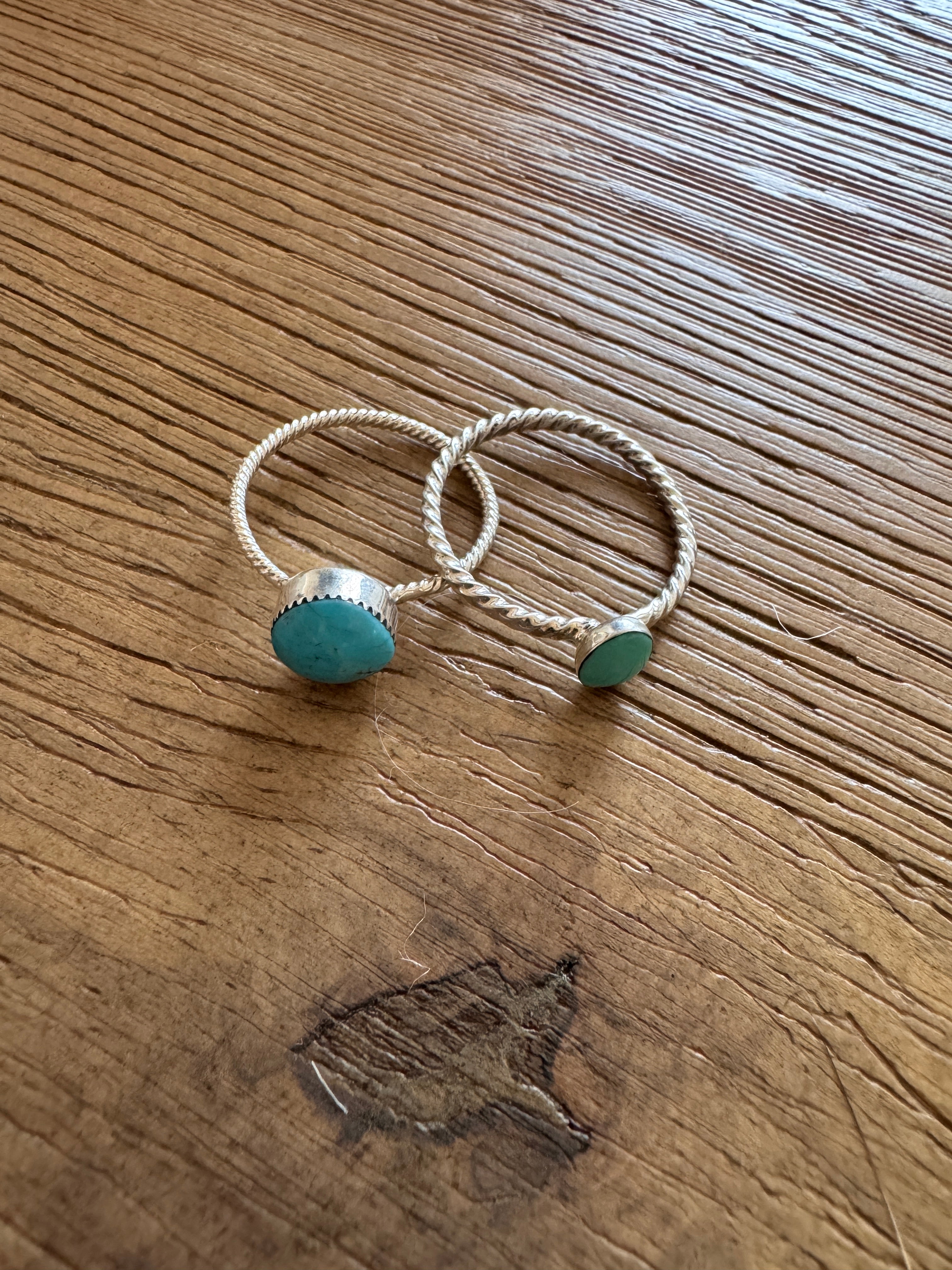 With a rope-textured sterling silver band and calming ocean-toned turquoise stone, the Twist of Tide Ring is all about subtle strength and movement. One features a bold round turquoise with a serrated bezel, evoking the pull of deep waters, while the other carries a softer sea-green stone in a smooth setting- like a quiet tide meeting the sand.