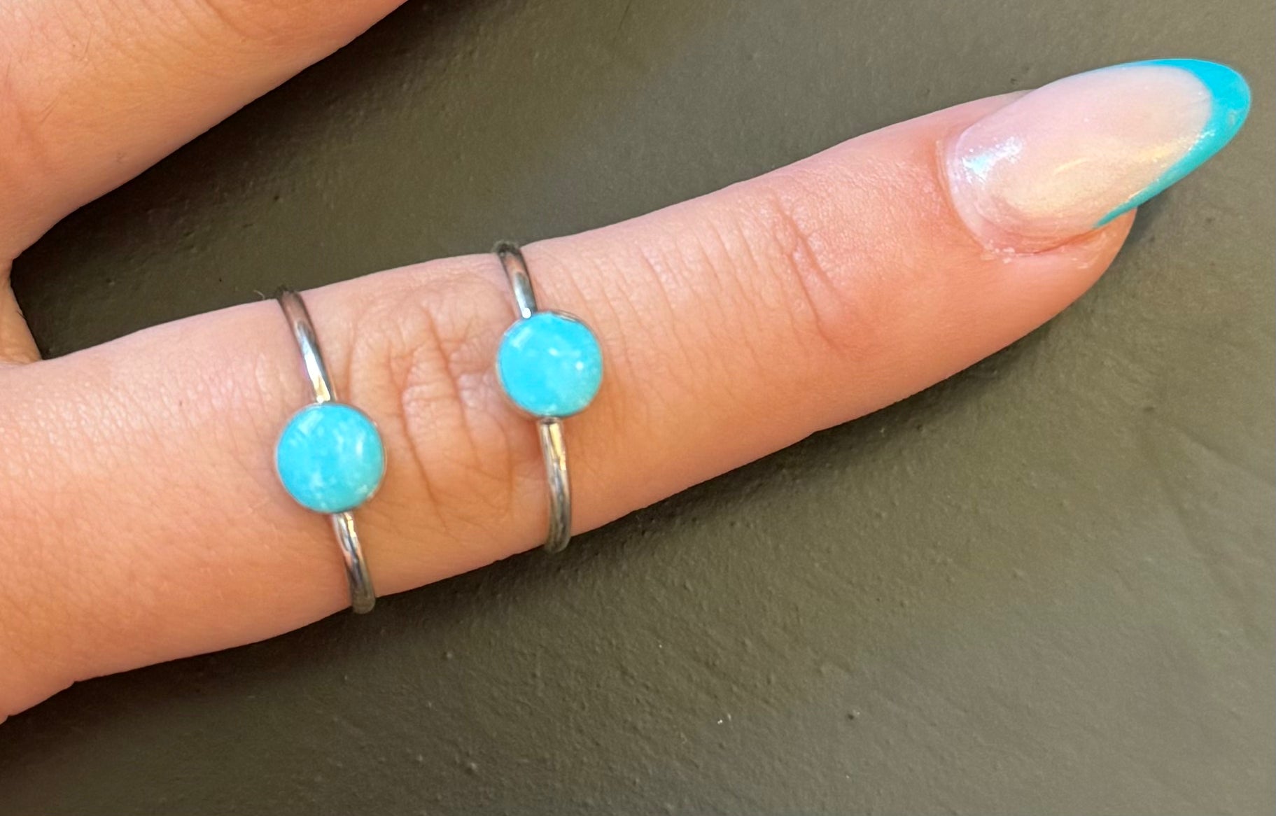 Handcrafted by Zuni artist Arlinda Lalio, this sterling silver ring features a small, round, turquoise stone at its center. It's minimalist design allows the natural beauty and vibrancy of the stone to shine through, adding a pop of color to any outfit.