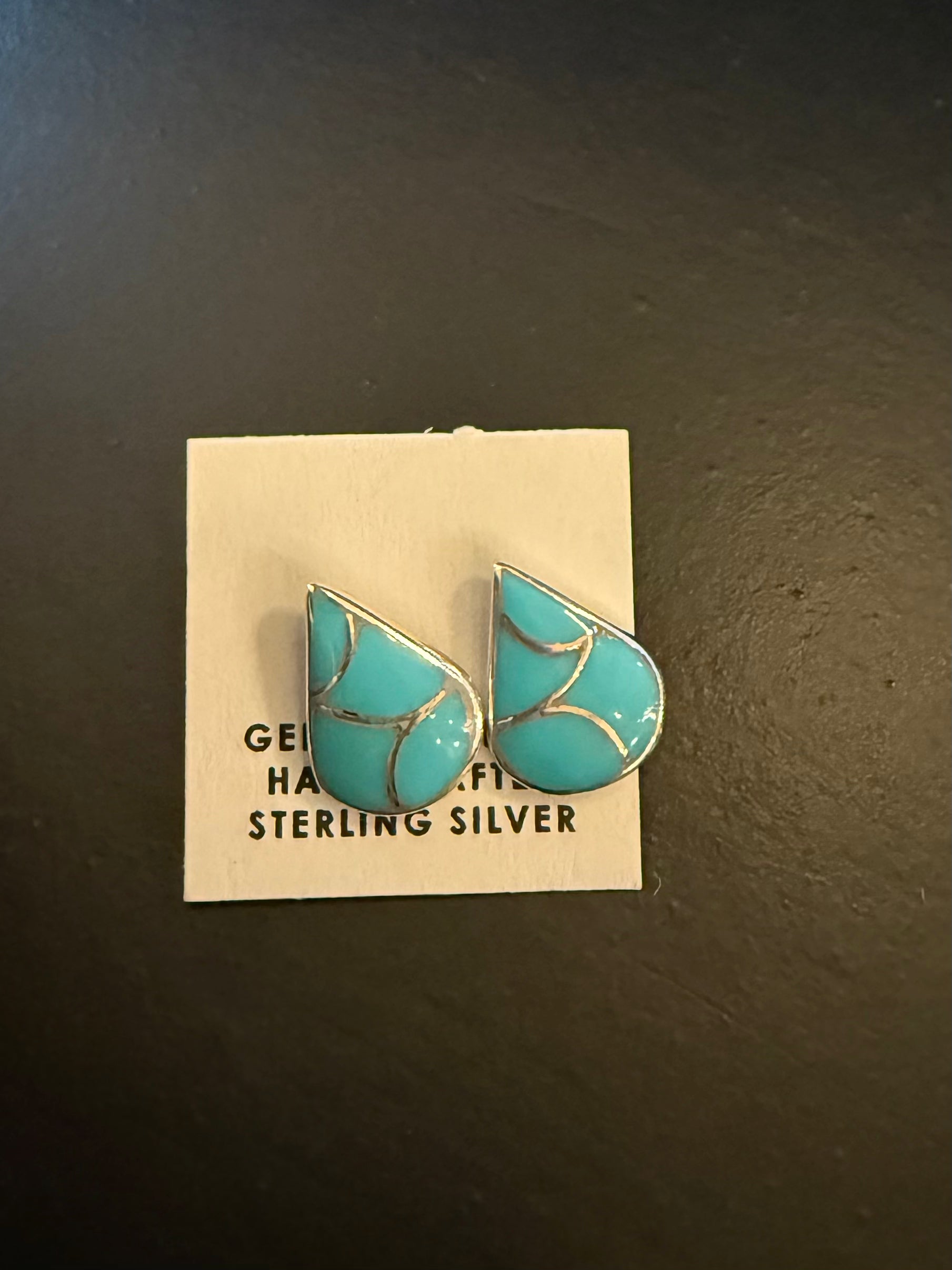 Expertly handcrafted by Zuni artist Orena Leekya, these earrings feature teardrop-shaped turquoise stones, set in sterling silver, each accented with fine silver lines.